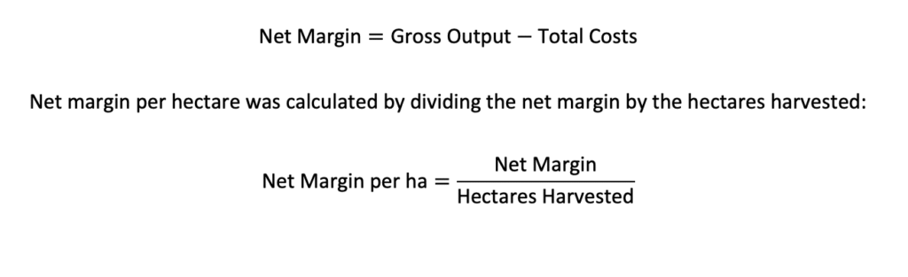 For each farm, gross output was calculated by multiplying delivered tonnage by the base price per ton. Total costs included haulage, cutting, baling, chasing, turning, and storage. The net margin was then calculated as: